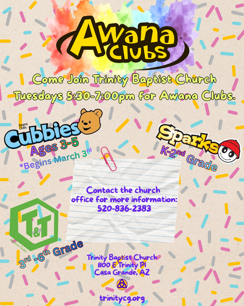 Awana meets every Tuesday at 5:30 p.m. and is open to all children from K to 6th grade.