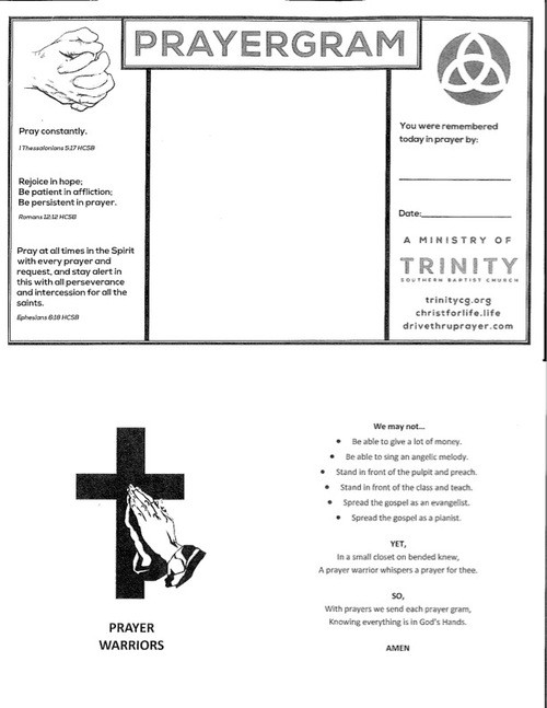 The Prayer Warriors meet every Sunday at 4:00 p.m. in the Trinity Fellowship Hall to pray and write Prayer Grams for people in need.